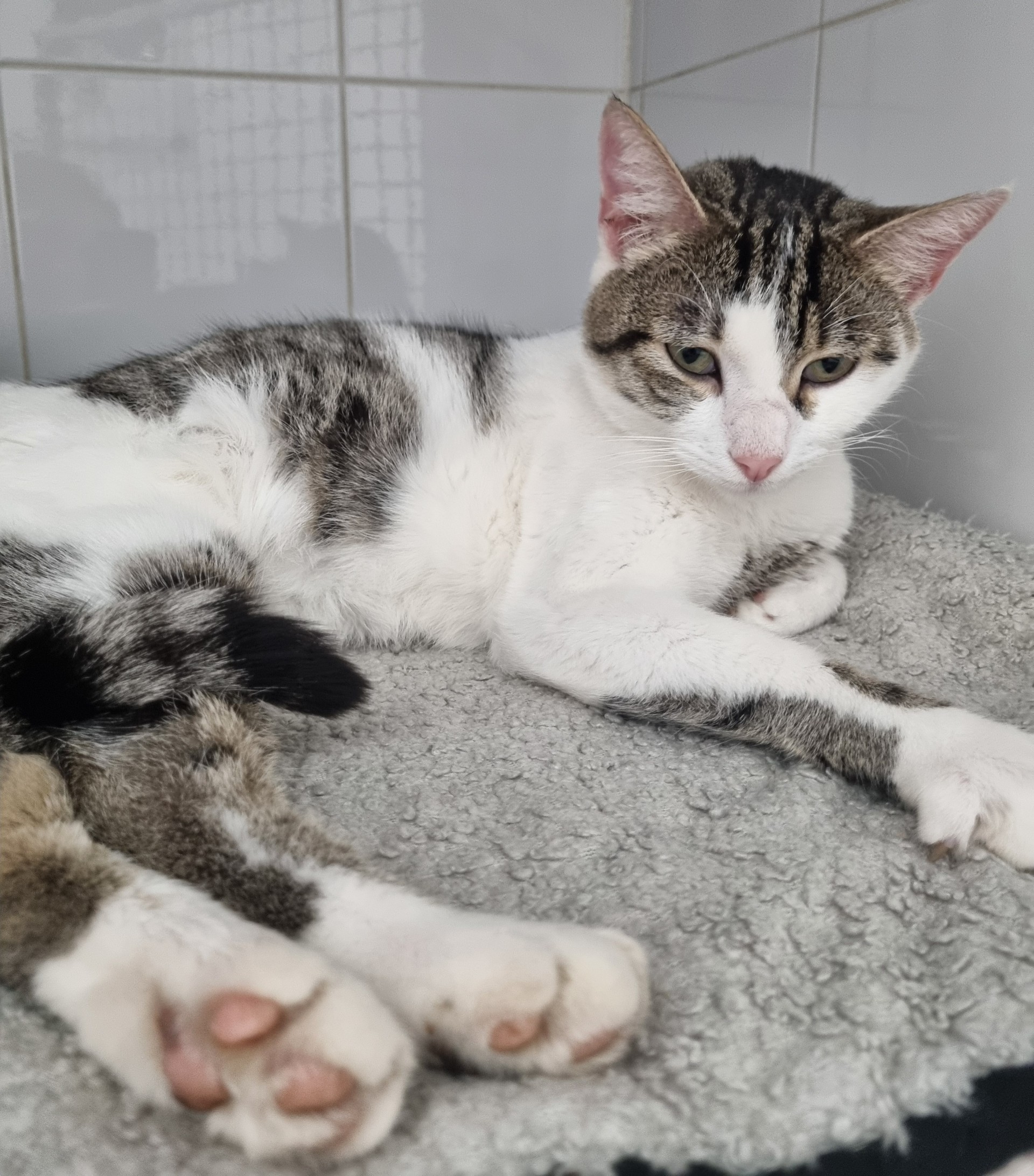, nicht bekannt ob kastriert, nicht gekennzeichnet, EKH, weiß/getigert, ca. 1 Jahr alt