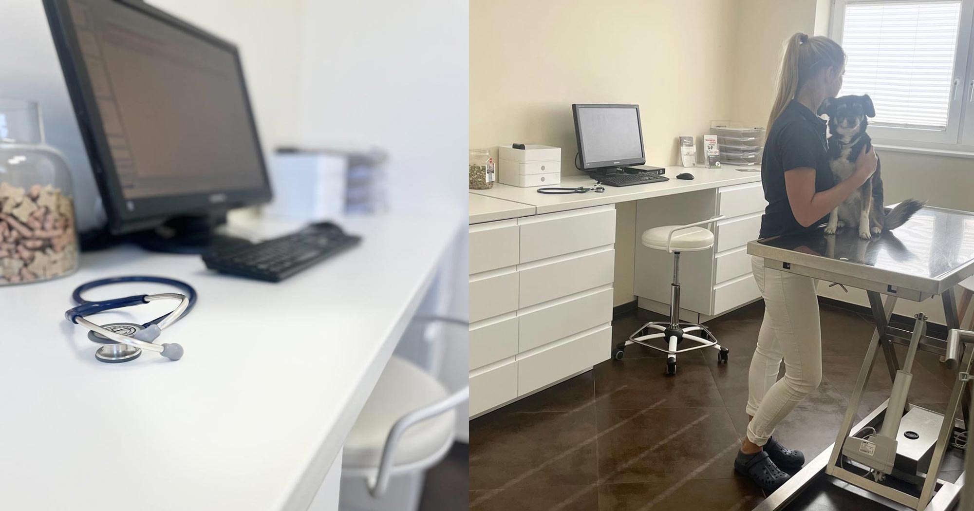 Die Untersuchung Ihres Tieres findet in unserem Behandlungsraum statt. Alle Instrumente und Hilfsmittel für die Untersuchung befinden sich mit im Raum. Unsere höhenverstellbaren Untersuchungstische bringen große und kleine Patienten auf Arbeitshöhe.