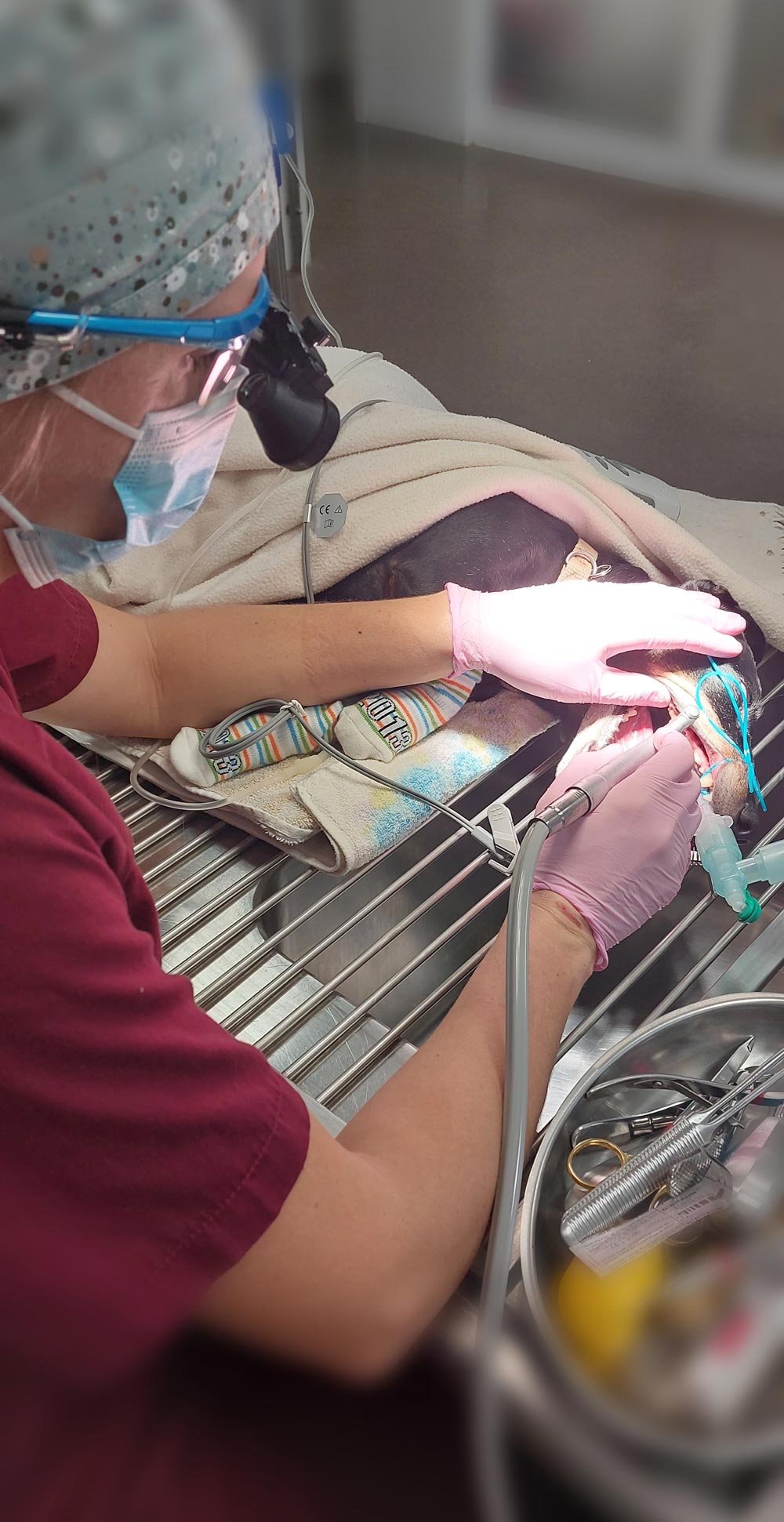 Wenn ein Zahn so weit geschädigt ist, dass eine Behandlung nicht mehr zielbringend wäre, so kommt nur eine Extraktion infrage. Dies bedeutet eine Entfernung bzw. Ziehen eines oder mehrerer Zähne mittels spezieller manueller und motorbetriebener Instrumente. Viele Zähne des Hunde- und Katzengebisses haben deutlich größere Wurzeln als die Zähne des Menschen. Dadurch sind sie sehr viel fester im Kieferknochen verankert, um den Bedürfnissen eines Raubtiergebisses und den damit einhergehenden hohen Belastungen gerecht zu werden. Dies macht jedoch auch die Extraktion der Zähne sehr anspruchsvoll. Oftmals müssen Teile des Kieferknochens mit einer Dentalfräse entfernt werden, um einen Zahn zu mobilisieren. Im Rahmen einer jeden Zahnextraktion wird der verbliebene Knochen geglättet und die eröffnete Gingiva (Zahnfleisch) fachgerecht mit resorbierbarem Nahtmaterial verschlossen. Dies verhindert das Eindringen von Nahrungsbestandteilen und anderen Fremdkörpern und ist essenziell für ein schnelles Abheilen.