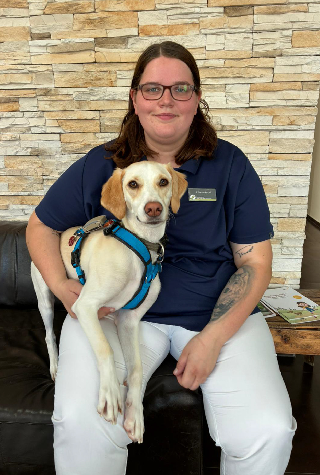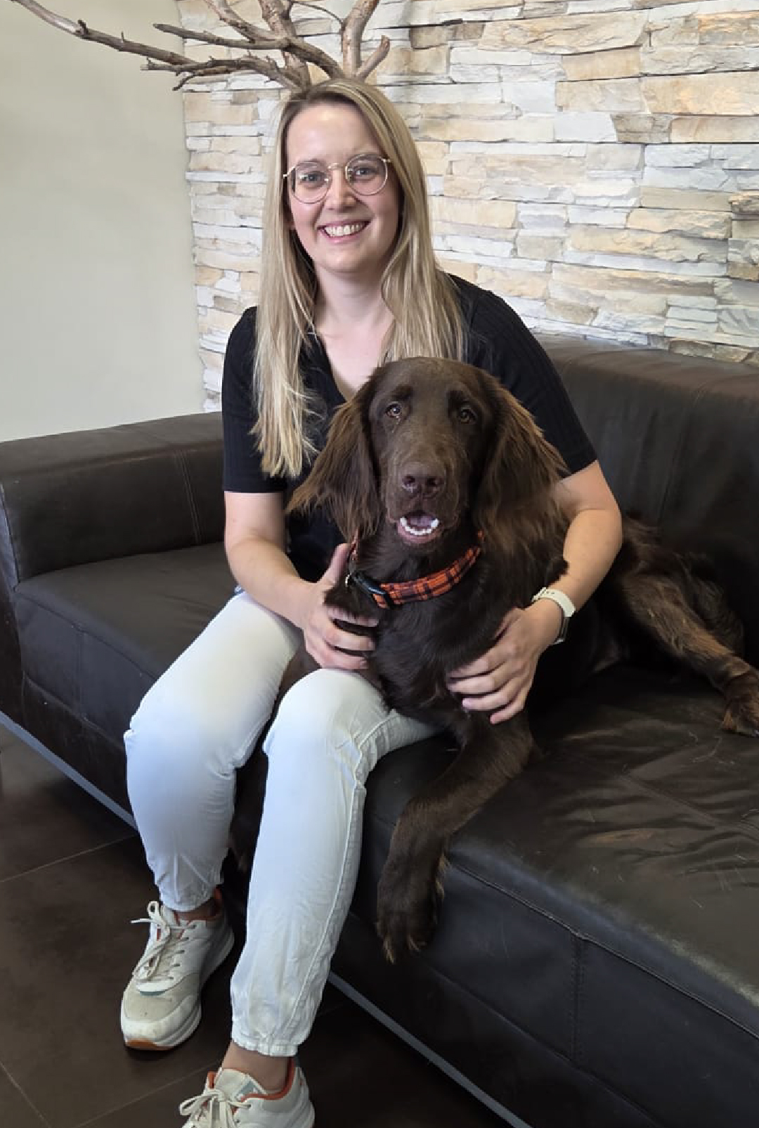 Ihr Hund Atos begleitet sie fast täglich und bringt zusätzlich gute Laune ins Team. Auch in ihrer Freizeit widmet Johanna viel Zeit den Tieren: Sie liebt lange Spaziergänge mit Atos, beschäftigt sich gerne mit Kleintieren und genießt es, draußen in der Natur unterwegs zu sein. So lebt sie ihre Tierliebe nicht nur im Beruf, sondern auch privat.